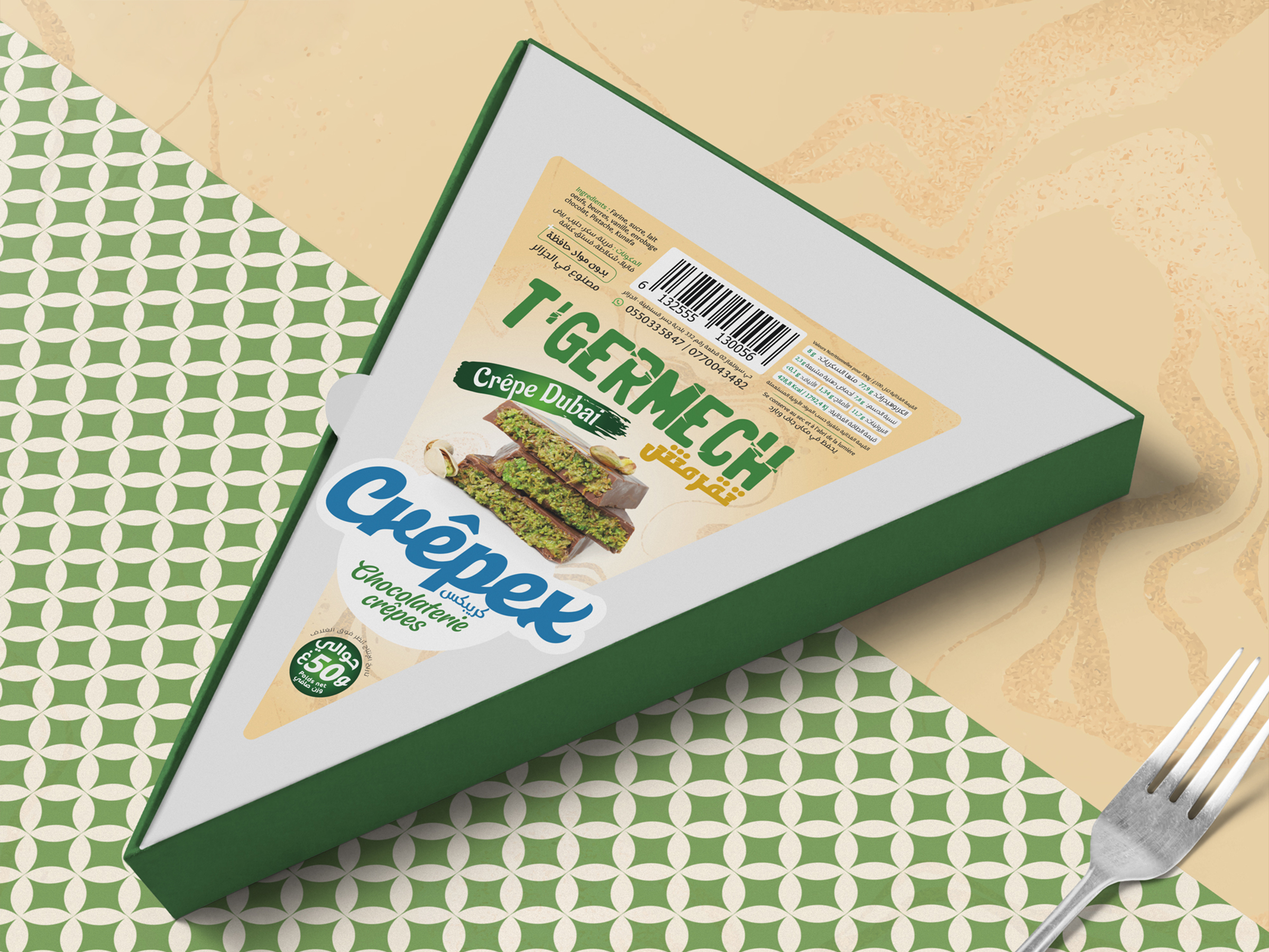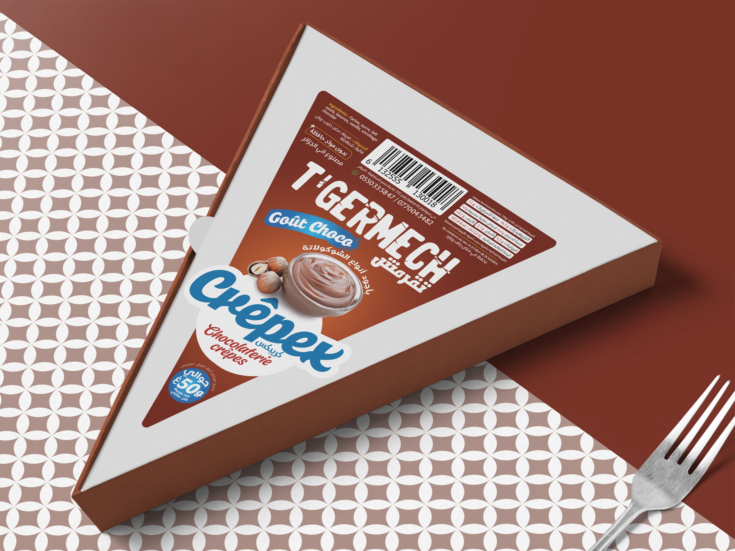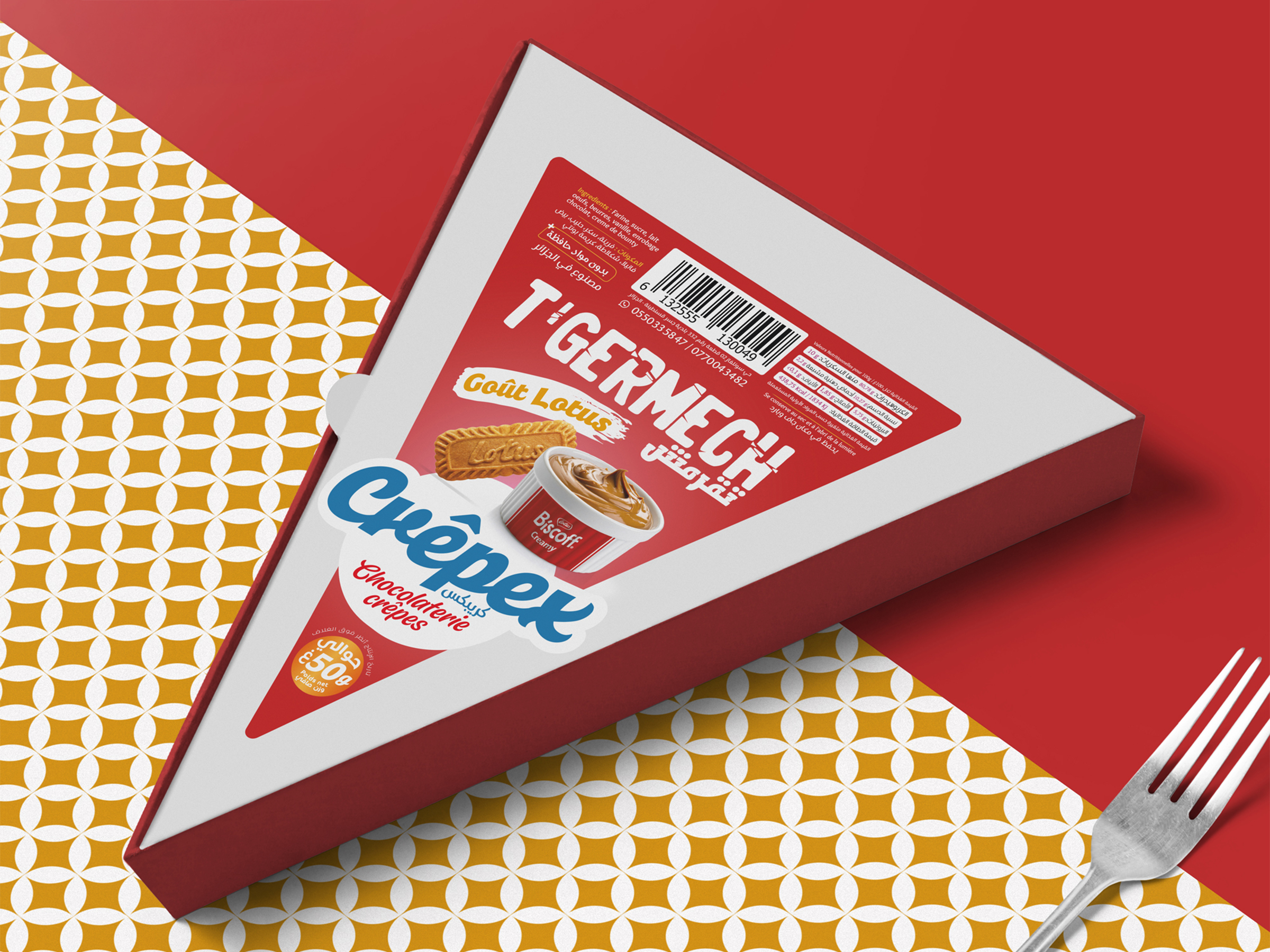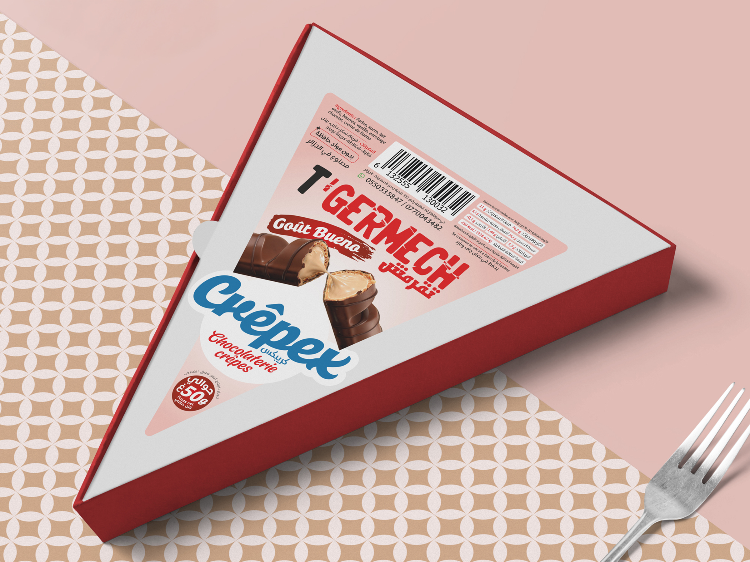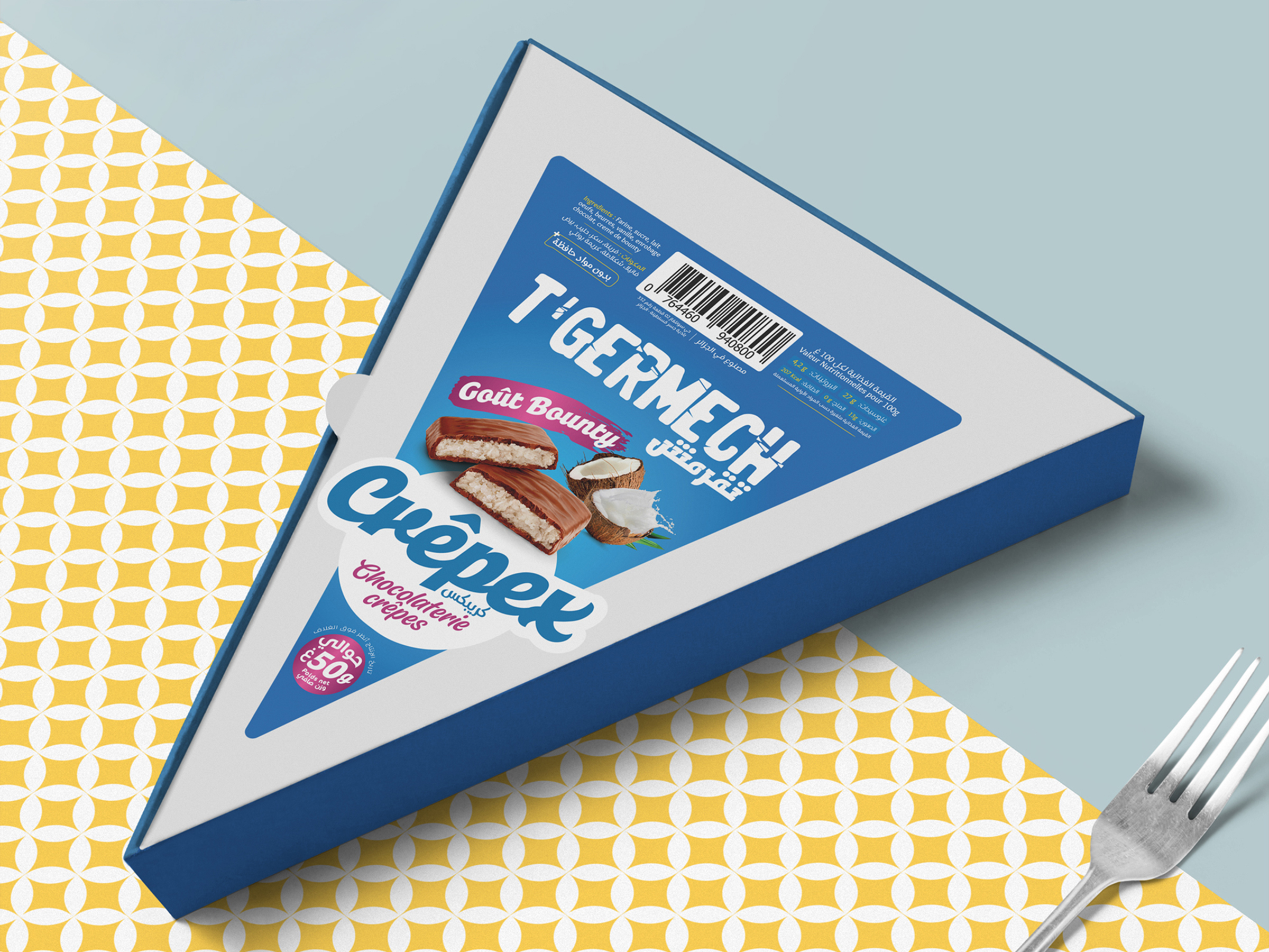 For the Crepex, the design was created to combine the convenience of a grab-and-go format with the promise of an irresistible texture. The triangular packaging, shaped like a single slice of crêpe ready to be enjoyed, was chosen for its originality. Meanwhile, the name « T’germech!"—which means "crunchy"—reassures consumers about the product's quality. This modern and creative design, featuring a generous illustration of coconut and chocolate, catches the eye and guarantees that, despite being vacuum-sealed, the crêpe retains its perfect crunch, offering a unique and delicious tasting experience.