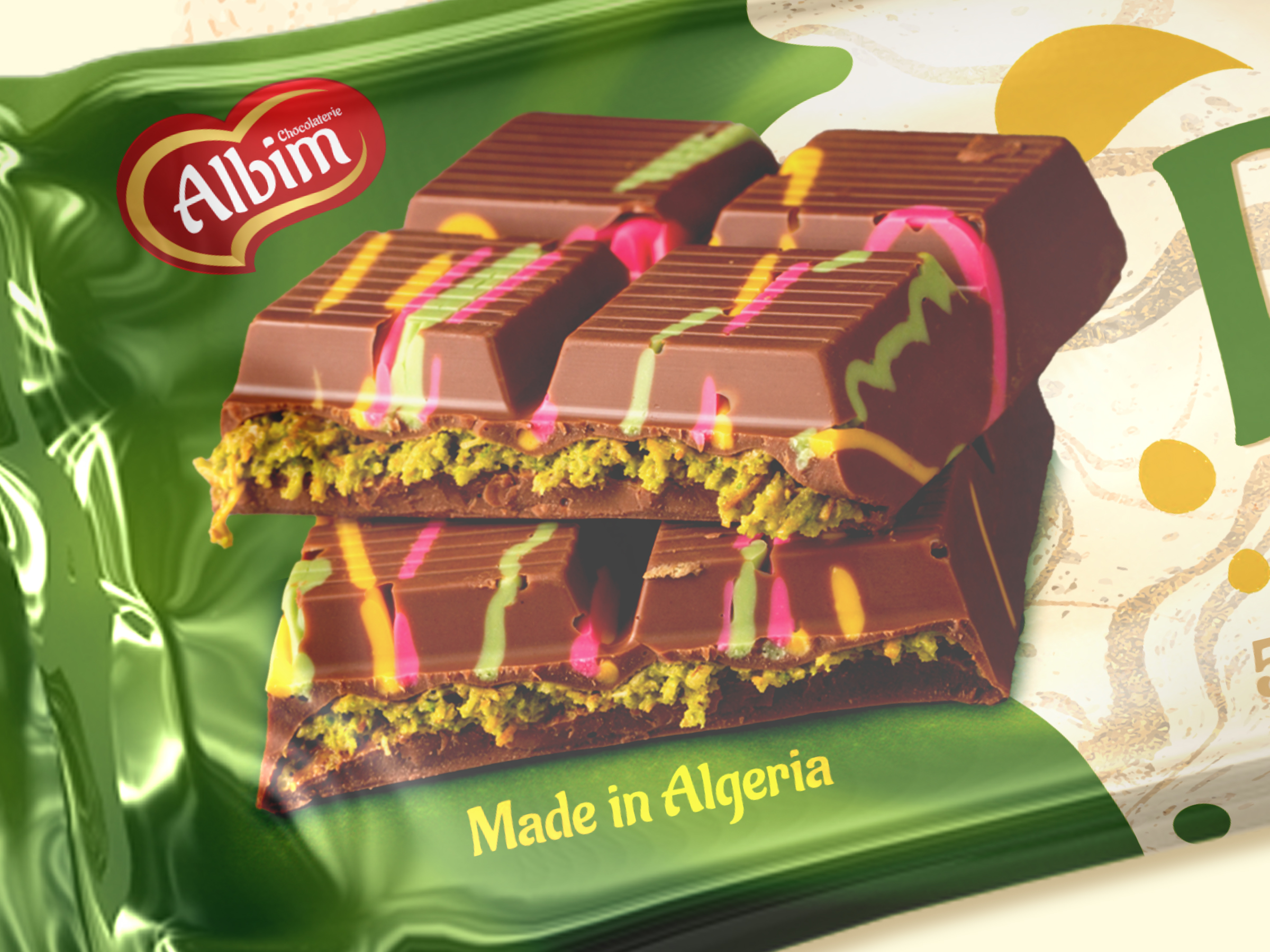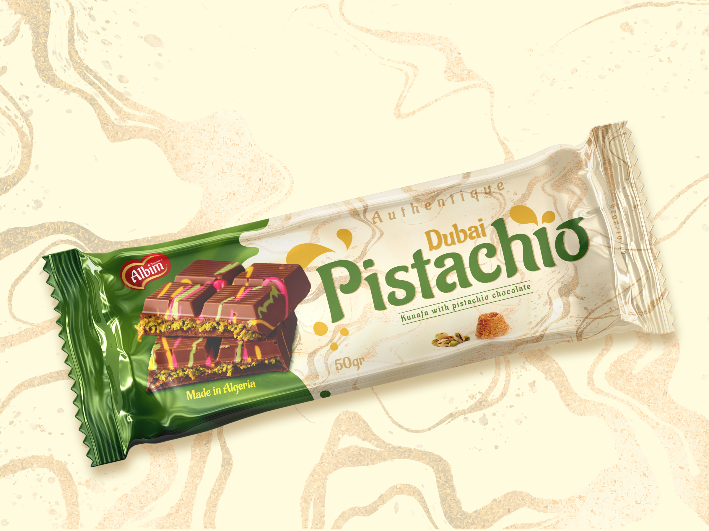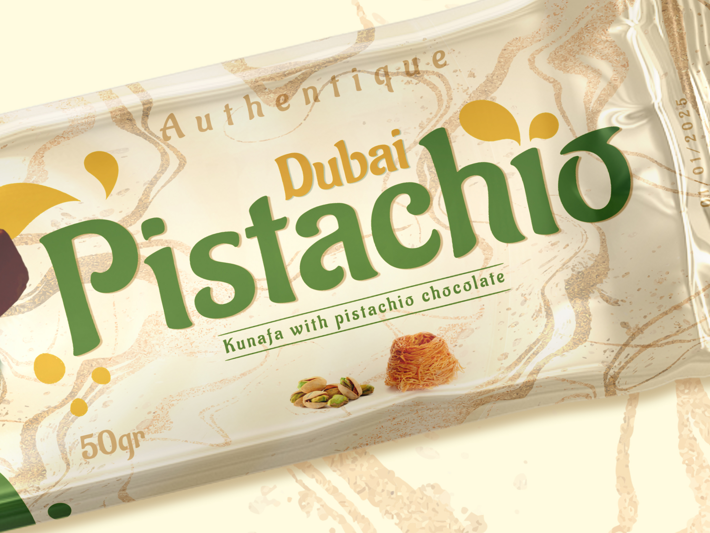The design for the Dubai Pistachio bar was crafted to embody the elegance and rich flavors of the Middle East. The background with golden marble patterns, combined with touches of pistachio green, conveys a sense of luxury and sophistication. The refined typography and product illustration, rich with pistachios, highlight its authentic character and unique composition, inspired by the dessert kunafa.