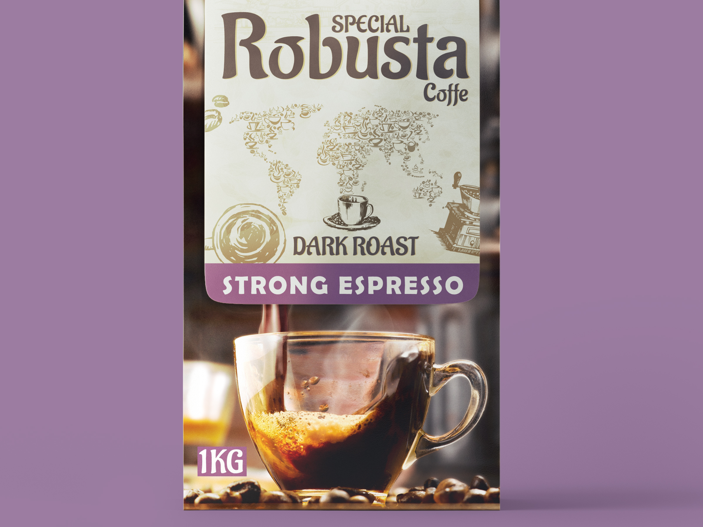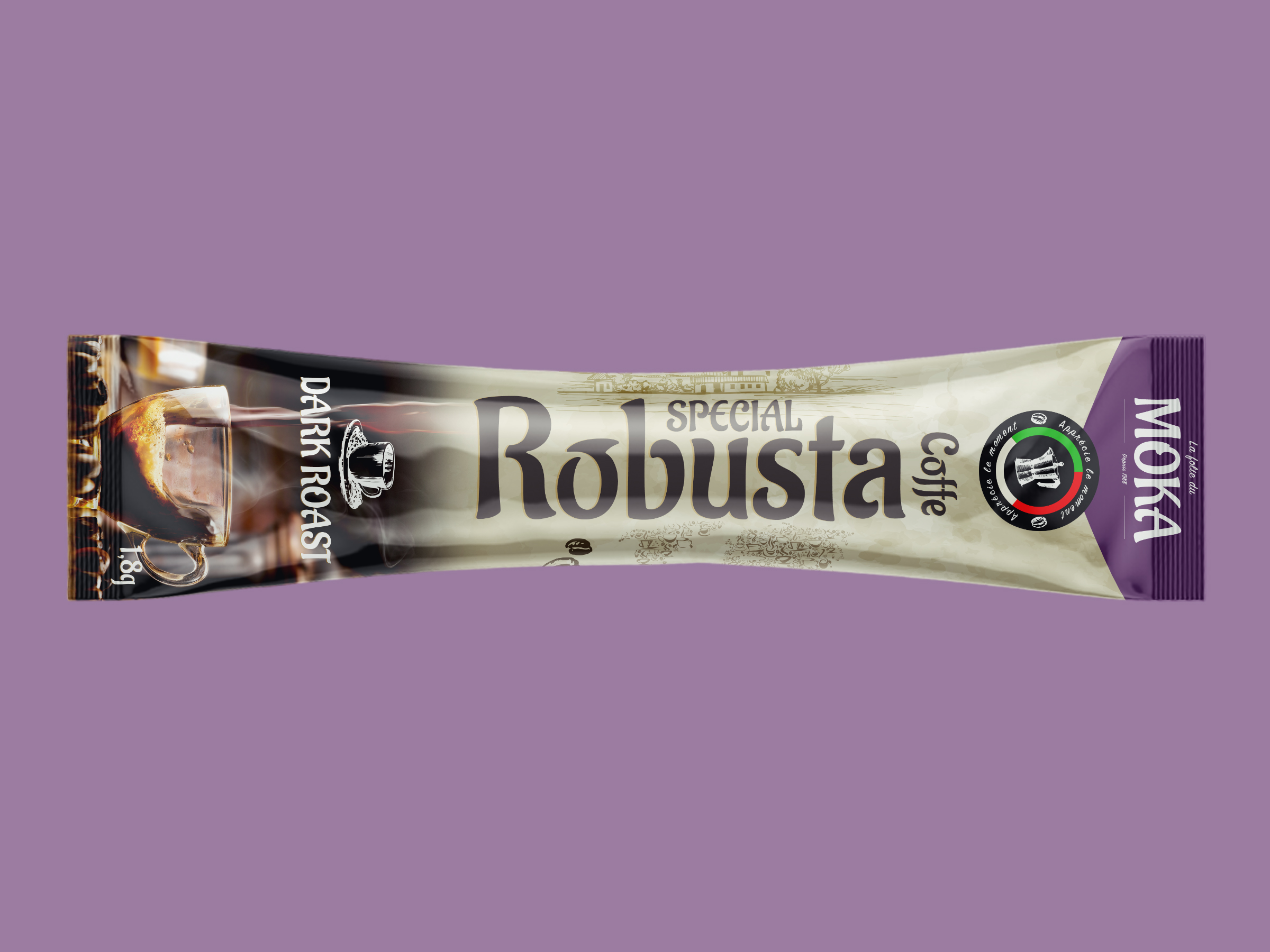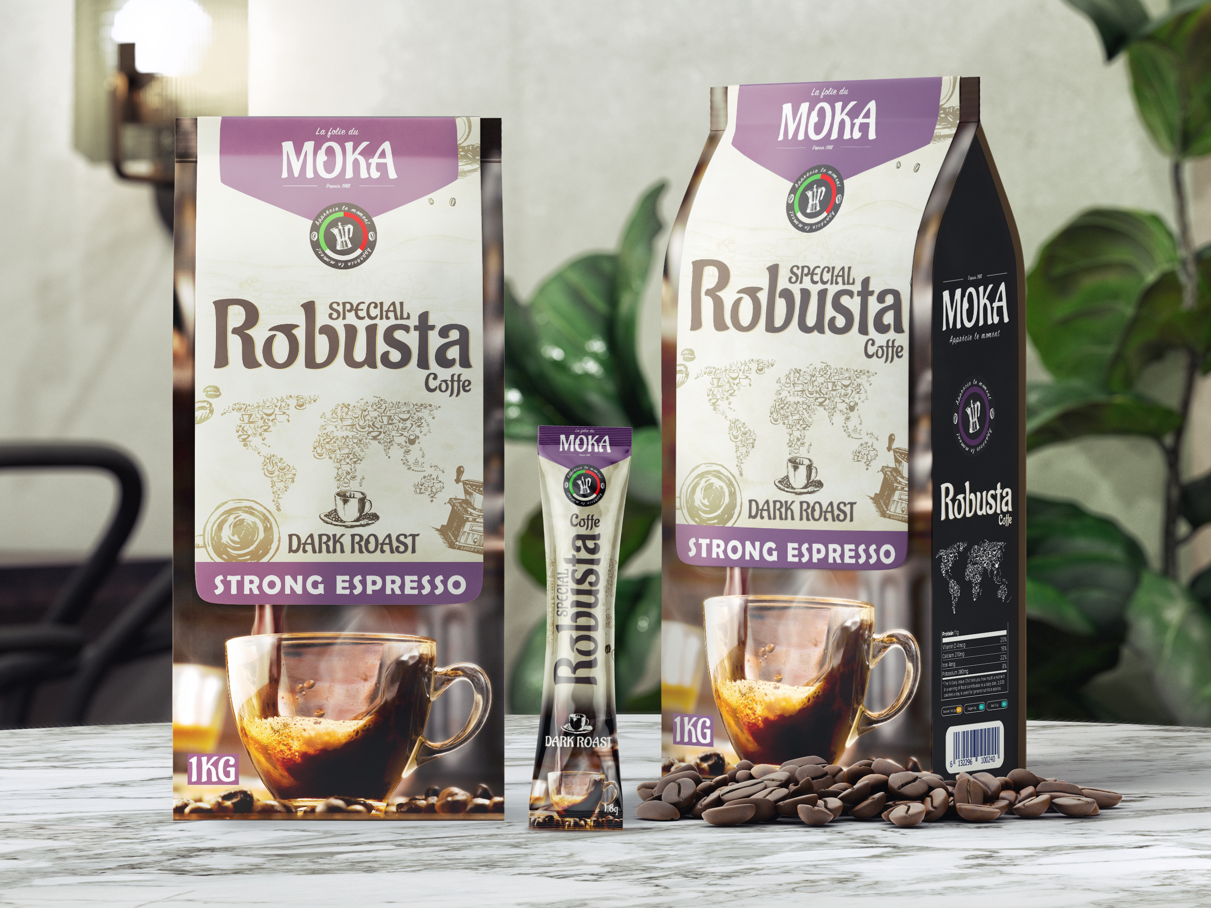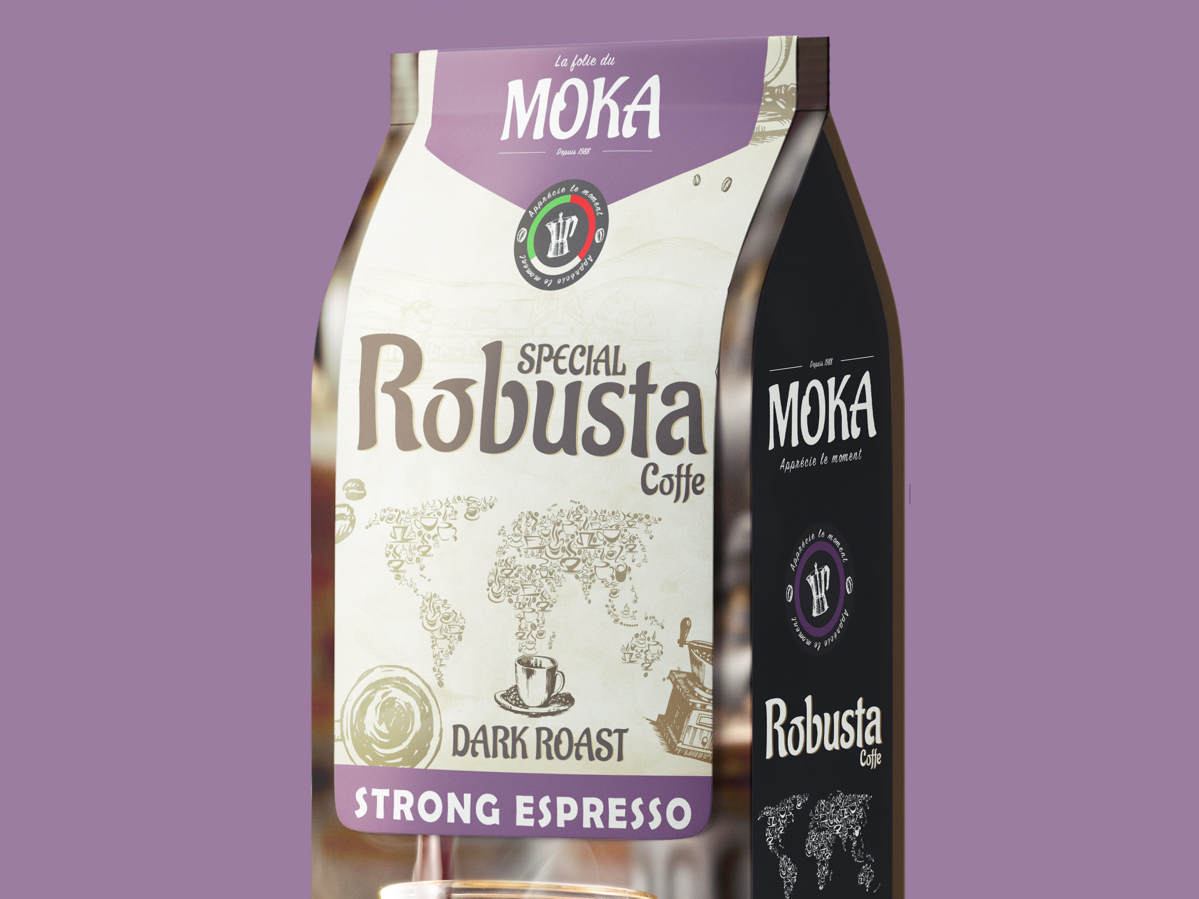 For Moka Robusta coffee, the goal was to create a packaging that highlights its strong and authentic character. The earthy tones, combined with a world map and illustrations of coffee beans and a cup of espresso, evoke the product's origins and quality. The clear labels "Special Robusta Coffee" and "STRONG ESPRESSO" target coffee lovers seeking an intense, roasted experience. The design combines tradition with the promise of a rich flavor.